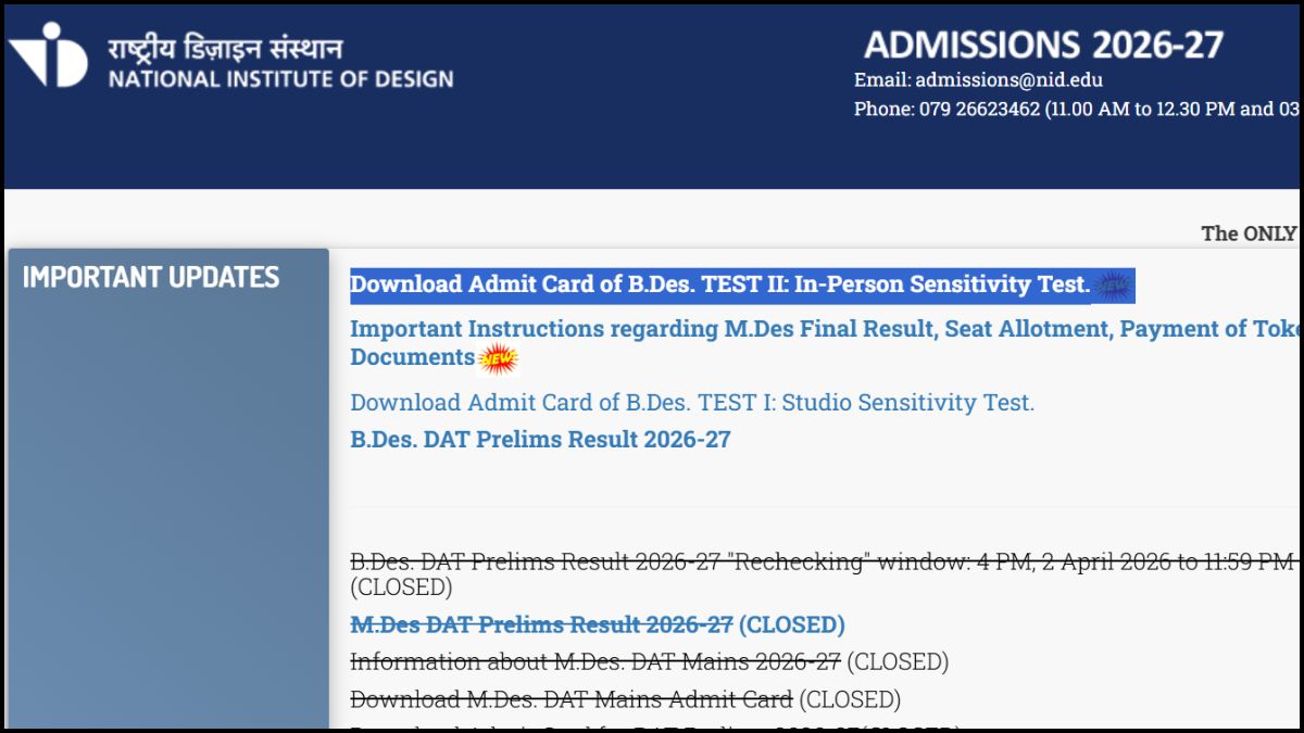 The Admit card for NID B.Des Mains In-person Sensitivity Test II has been released today by the National Institute of Design. Candidates can download the admit card and start preparing for the Interview now.