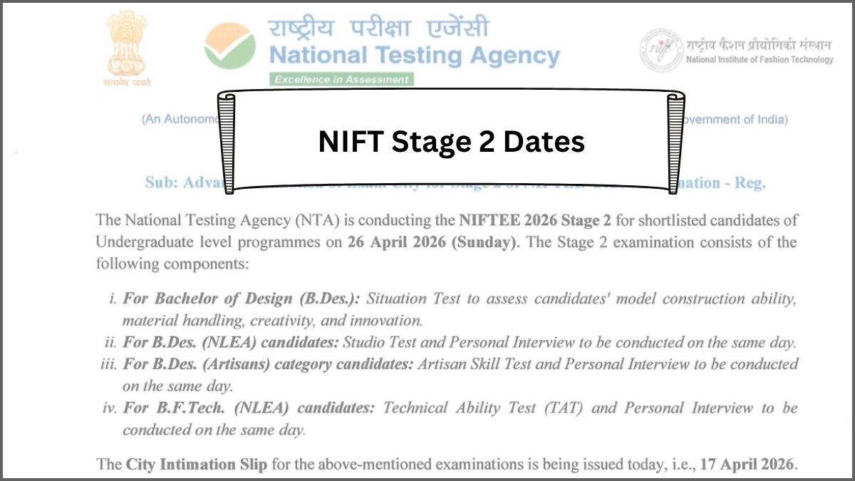 The dates for NIFT Stage 2 are out now on the website of NIFT. The Situation Test for B.Des, Studio Test and Personal Interview for B.Des (NLEA), Artisan Skill Test and Personal Interview for B.Des (Artisan), Technical Ability Test (TAT) and Personal Interview for B.F.Tech will be held on April 26, 2026.