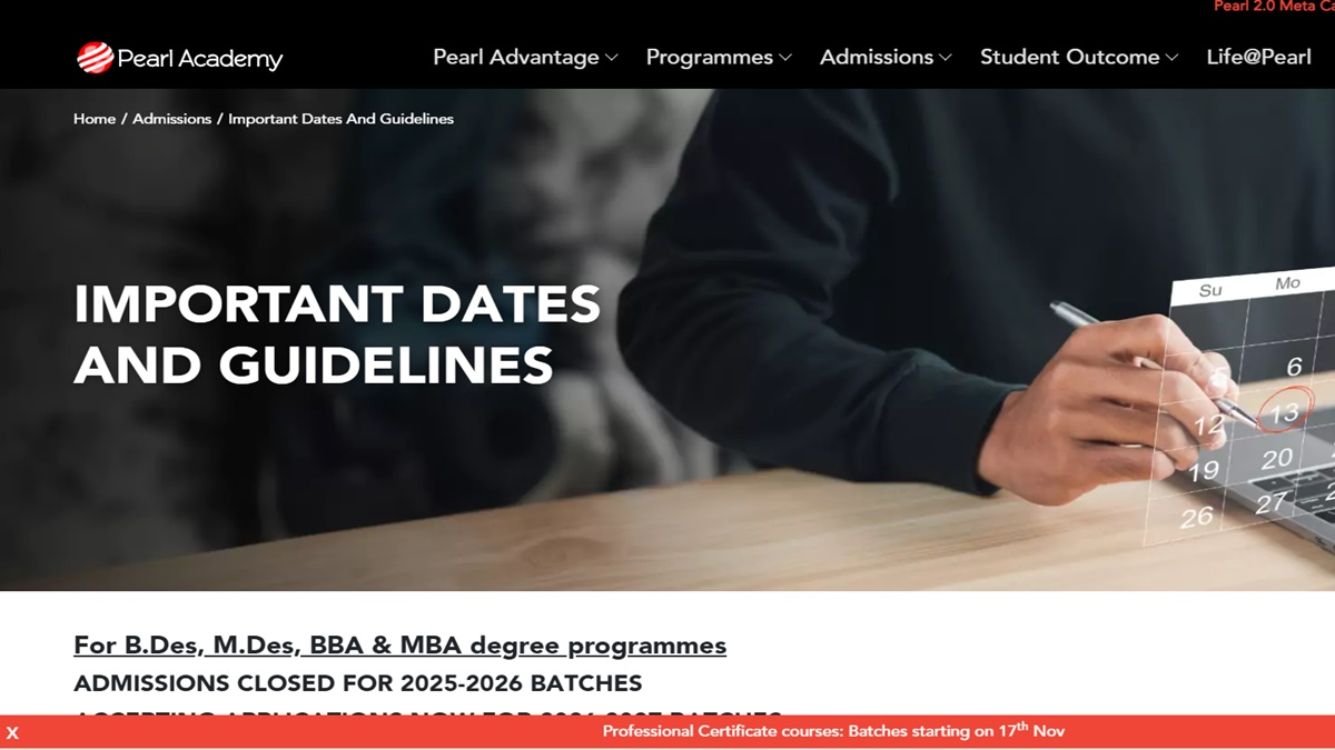 Pearl Academy has begun admission process for 2026β27 academic session, inviting applications for its full-time undergraduate and postgraduate programmes. The institute offers Bachelor of Design (B.Des), Master of Design (M.Des), Bachelor of Business Administration (BBA) and Master of Business Administration (MBA) as well as certificate courses.