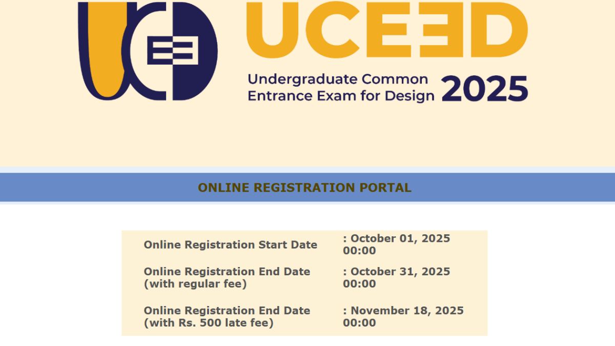UCEED 2026 registration dates are out on the registration portal of the official website. The application for UCEED 2026 will begin from October 01, 2025, 12 AM onwards. The last date to fill out the application form is October 31, 2025, 12 AM. Application can also be filled out with late fees of INR 500 till November 18, 2025.
