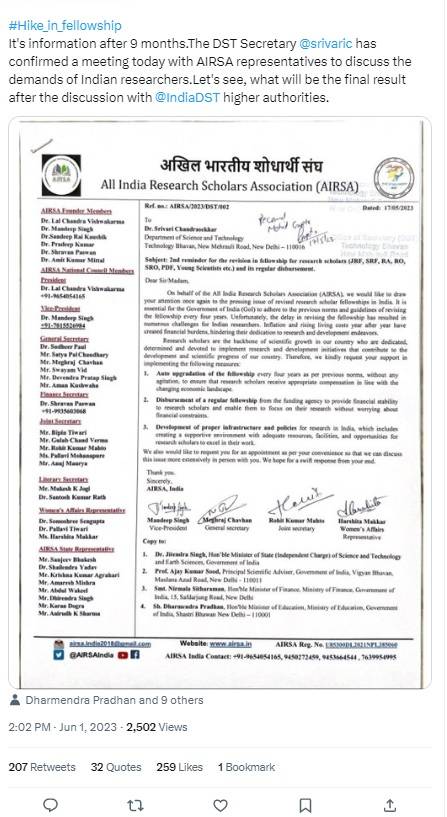 The AIRSA has announced that the DST secretary Dr. Srivari Chandrasekhar has confirmed a meeting to discuss the demands of Indian researchers. The All India Research Scholars Association (AIRSA) has in August 2022 reached out to DST officials demanding an immediate hike in fellowship. "It is essential for the government of India (GoI) to adhere to the previous norms and guidelines of revising the fellowship every four years. Unfortunately, the delay in revising the fellowship has resulted in numerous challenges for Indian researchers. Inflation and rising living costs year after year have created financial burdens, hindering their dedication to research and development endeavors," the letter stated.