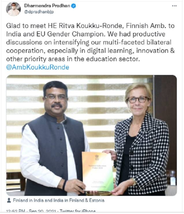 "Glad to meet HE Ritva Koukku-Ronde, Finnish Amb. to India and EU Gender Champion. We had productive discussions on intensifying our multi-faceted bilateral cooperation, especially in digital learning, innovation and other priority areas in the education sector," Unione Education Minister tweeted.