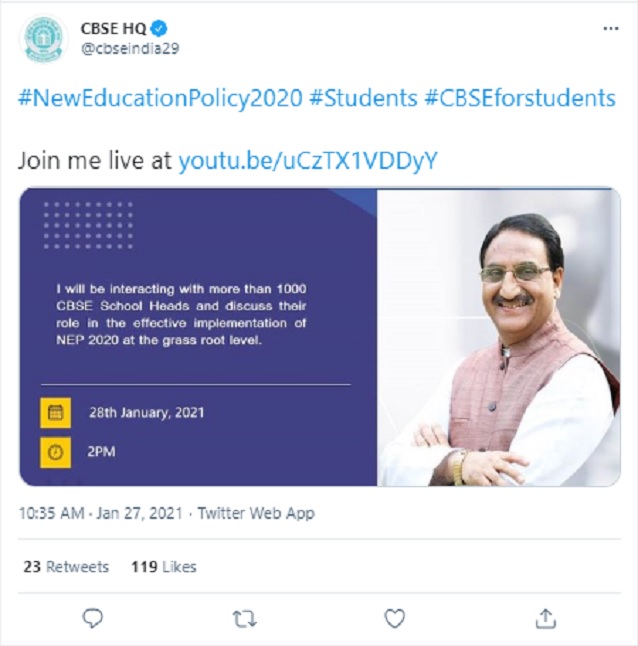 Union Education Minister Ramesh Pokhriyal Nishank has announced that he will be interacting with the heads of schools affiliated with the Central Board of Secondary Education (CBSE) tomorrow;i.e. January 28, 2020. He will be interacting with the CBSE school heads to discuss the role of schools in implementing the National Education Policy (NEP) 2020.