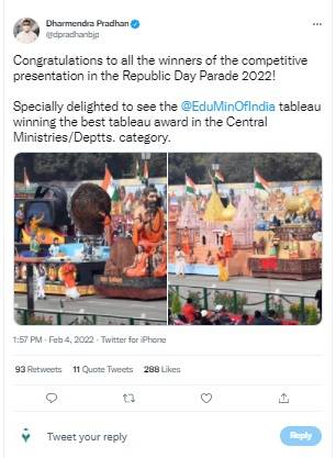 “Congratulations to all the winners of the competitive presentation in the Republic Day Parade 2022!” he tweeted. “Specially delighted to see the @EduMinOfIndia tableau winning the best tableau award in the Central Ministries/Deptts. category.”