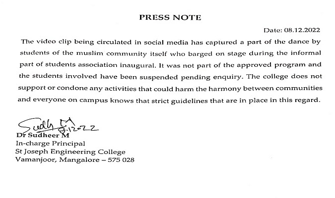 St Joseph Engineering College has issued a statement saying that the dance show was not part of the approved itinerary and that the students barged on stage and performed the dance.