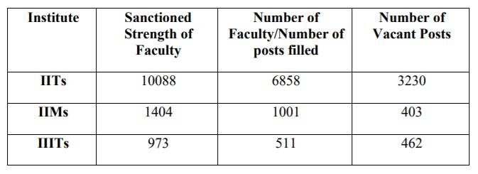 In the case of Indian Institutes of Management (IIMs) out of 1404 sectioned posts, 1001 are filled while 403 are lying vacant. The IITs, IIMs, IIITs and central universities are institutions of national importance and are run by the central government.