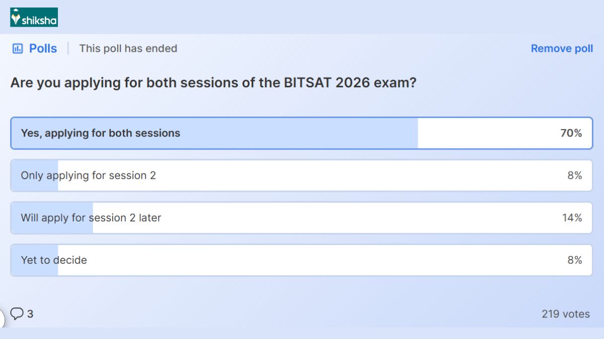Shiksha.com recently conducted a poll among BITSAT 2026 exam aspirants to know which session they are applying to, as this can help understand the level of competition between the two sessions. The poll recorded responses of 219 participants. The poll results reveal that 70% of this audience is applying to both sessions of BITSAT 2026.