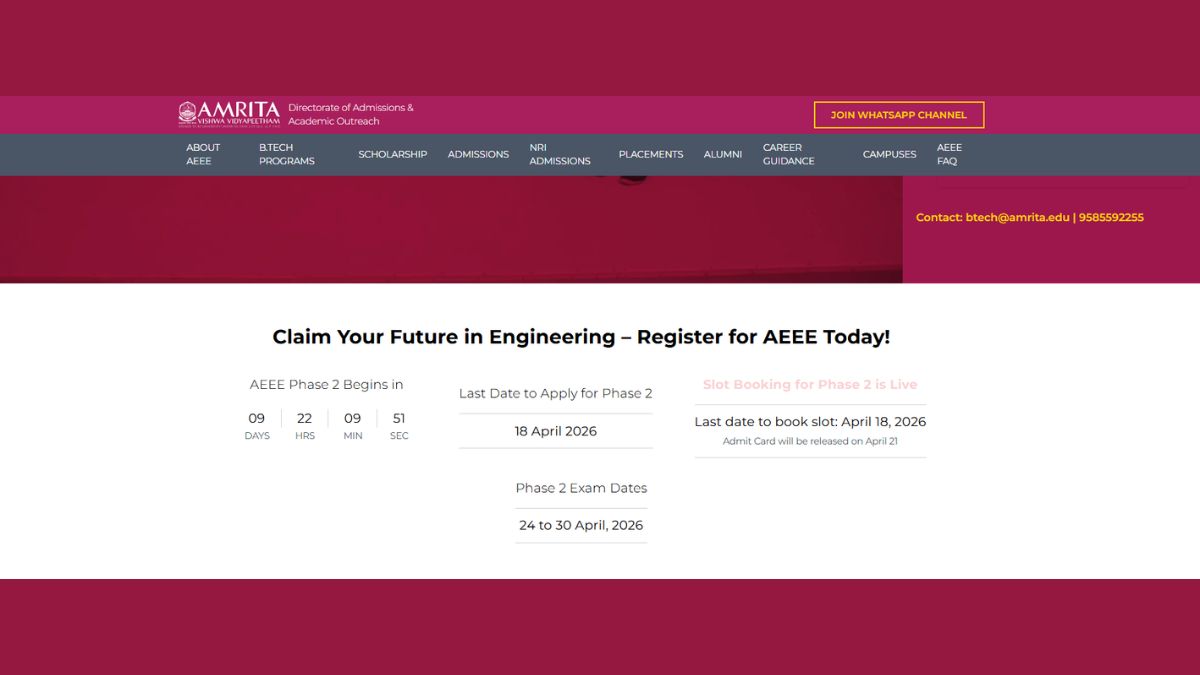 The AEEE 2026 phase 2 registration deadline is now April 18, which was earlier April 15. Candidates can complete AEEE registrations on the official website, aeee.amrita.edu. AEEE 2026 registration can be done online only, and to fill the AEEE application form, candidates have to complete their personal and academic profiles, fill in application details, pay the applicable fee, and upload scanned documents.
