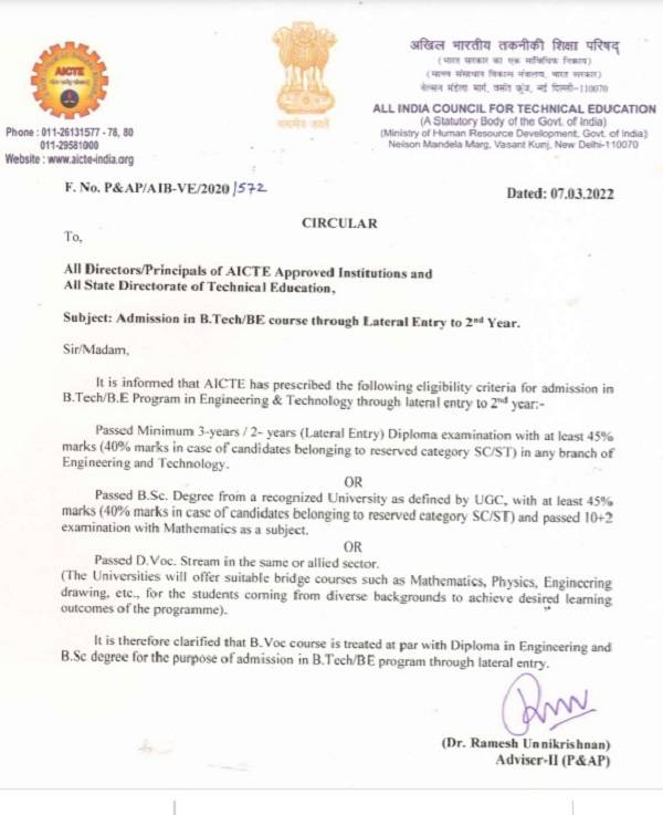 Eligibility criteria for AICTE BTech, BE Admissions 2022 via lateral entry
