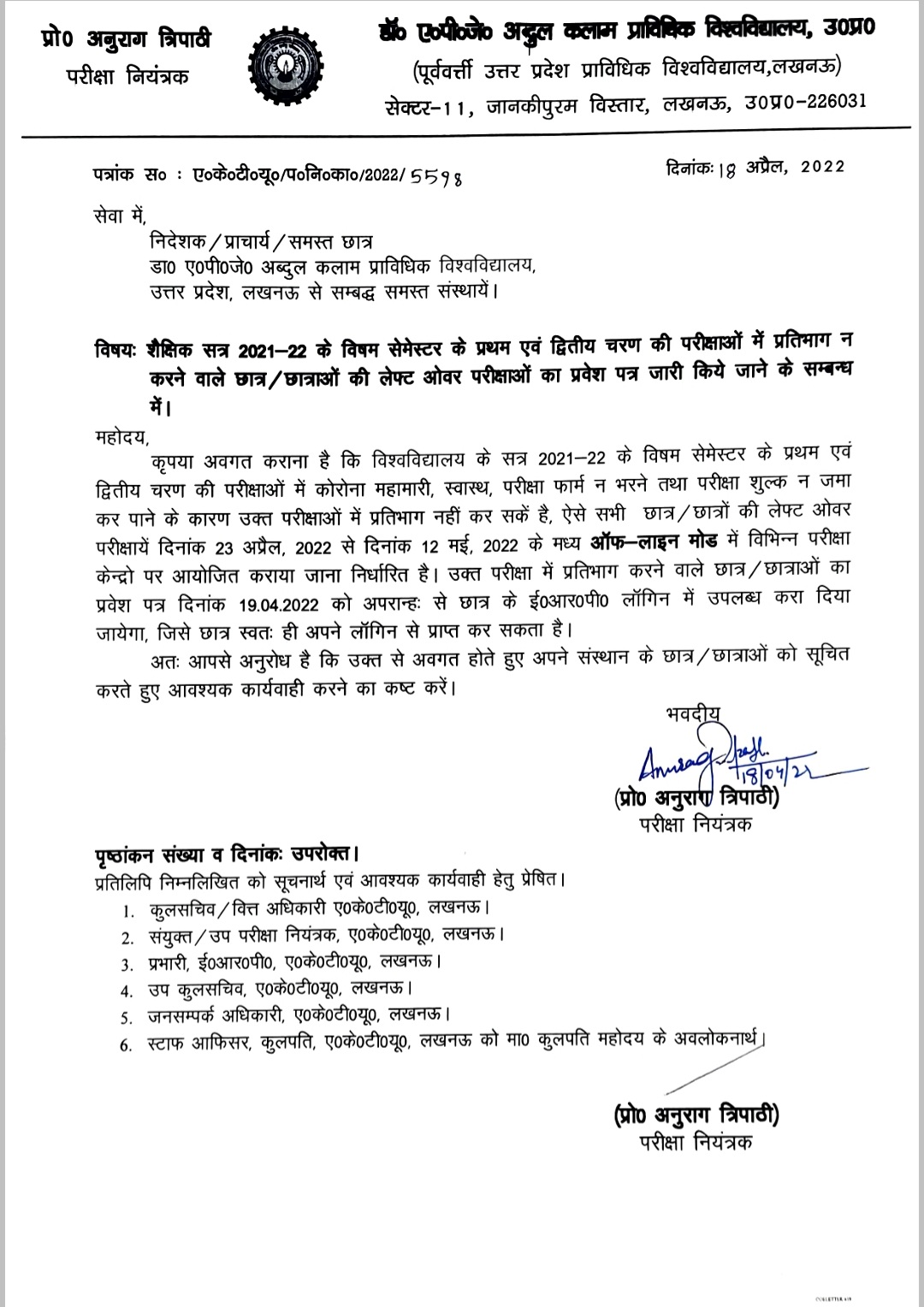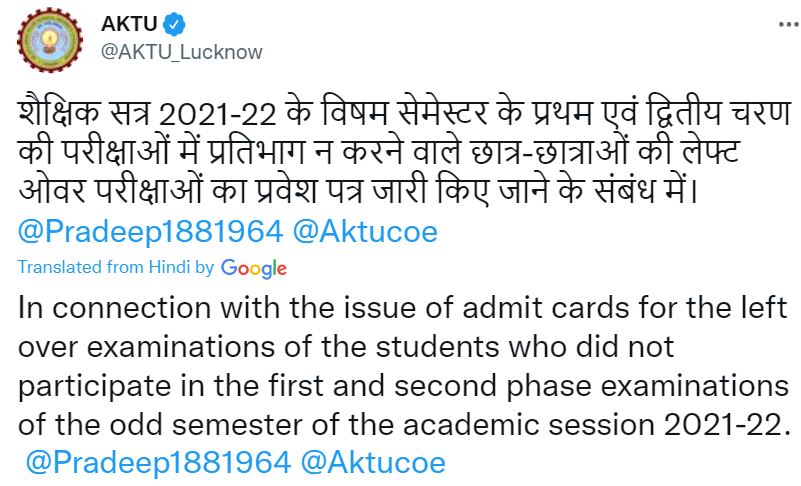 Informing students about the conduct of AKTU leftover exams 2022 and the release of the admit cards, AKTU took to its official Twitter handle and shared the notice. Check the tweet and circular below: