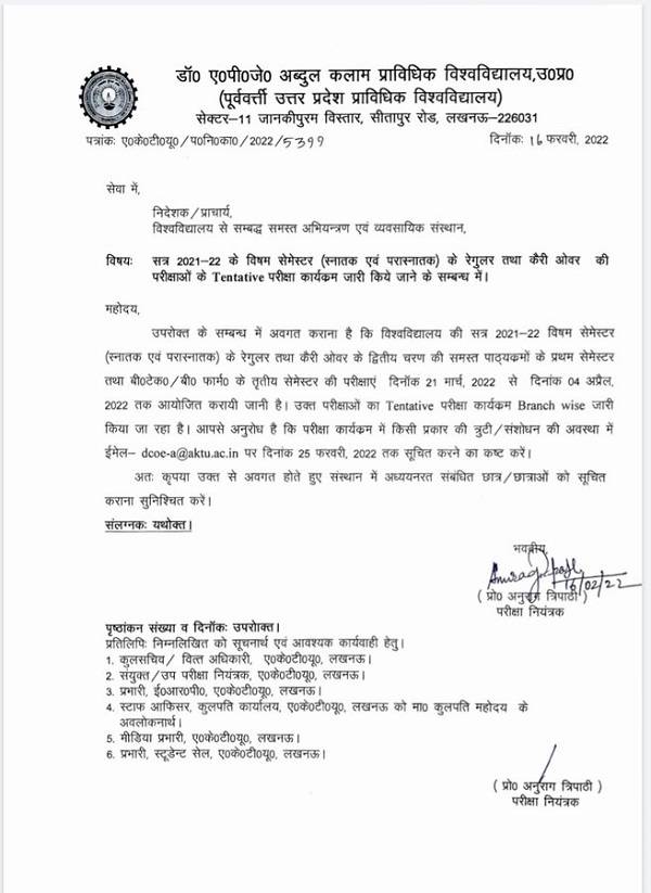 AKTU Odd Semester Exams 2022: Dr APJ Abdul Kalam Technical University (AKTU) has announced that it will conduct regular odd semester and carry over-exams for first, third semester and lateral entries from March 21, 2022. The university had earlier postponed the exams scheduled in February in view of the rising COVID-19 cases across the country.