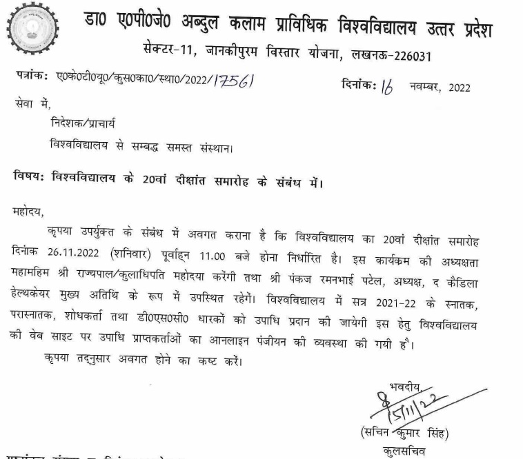 Dr APJ Abdul Kalam Technical University (AKTU) will organise its 20th convocation ceremony on November 26, 2022. The university has issued a circular regarding the same. It has also notified that students have to register for the convocation.