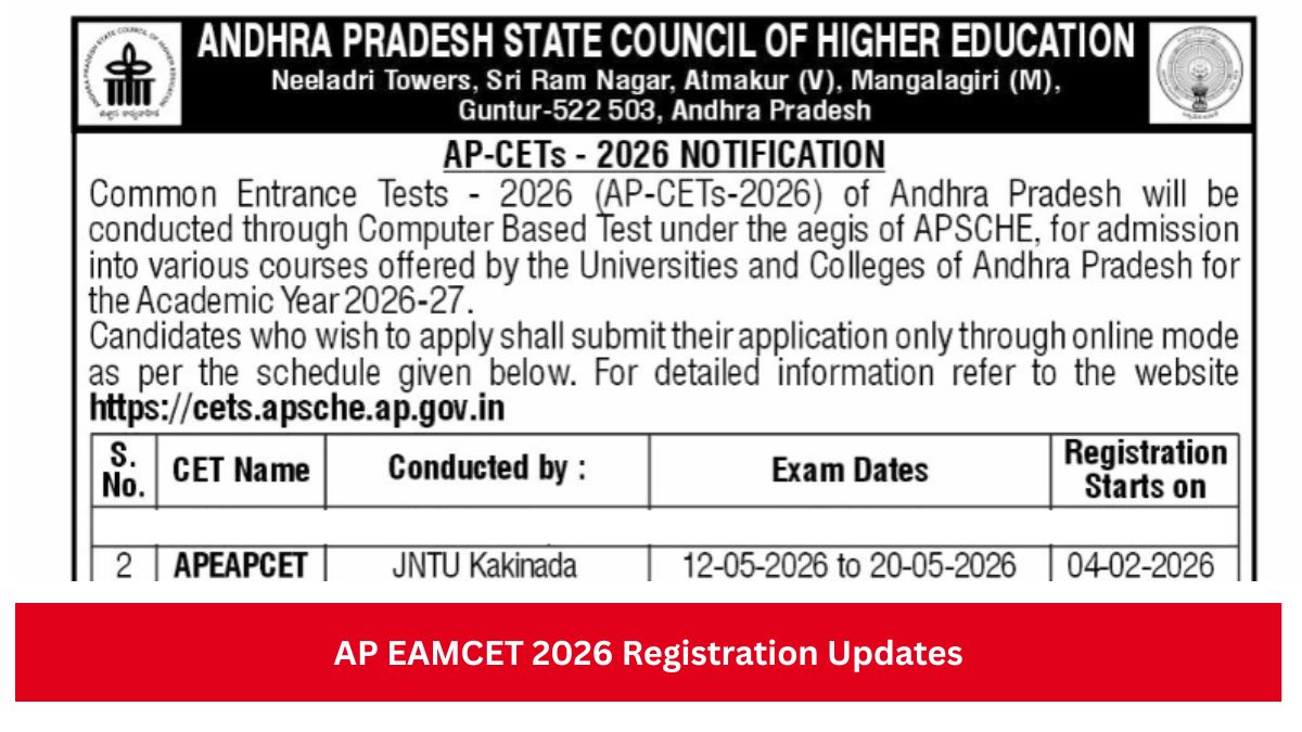AP EAMCET Registration: Jawaharlal Nehru Technological University Kakinada will start AP EAMCET 2026 registration today, February 4. Candidates must note that AP EAMCET application link will be activated only at official website cets.sche.ap.gov.in. As of now, only AP EAMCET registration last date has not been announced. It is likely that once AP EAMCET application starts, detailed notification and important dates will also be released.