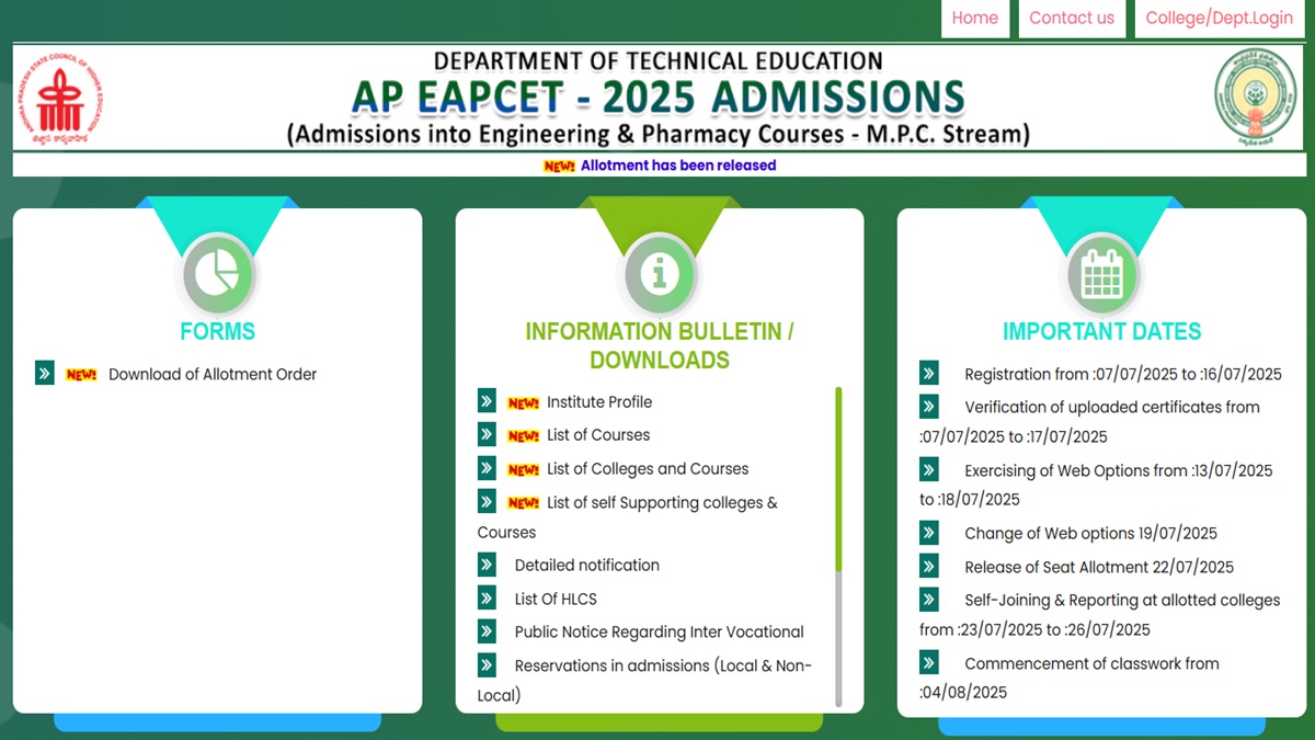 AP EAMCET Seat Allotment Result is OUT. The AP EAMCET Phase 1 Seat Allotment Link is now available on the official website, eapcet-sche.aptonline.in/EAPCET. Candidates must enter their hall ticket number and date of birth to access the AP EAMCET Counselling 2025 Seat Allotment status.