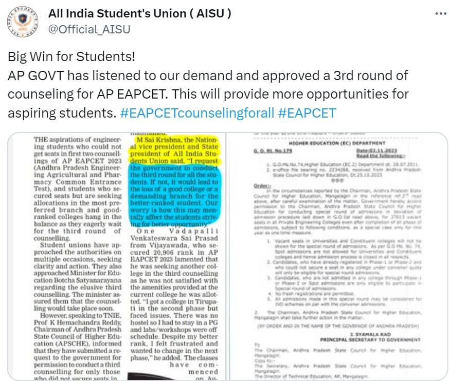 AP EAPCET Counselling Round 3 Approved! The Andhra Pradesh State Council for Higher Education/CETs-EAPCET-2023 has issued permission to conduct a Special round of admission for 27613 vacant seats in all Private Engineering Colleges even after completion of all phases of admissions. Expressing joy over the latest move, All India Student's Union (AISU), through its official X handle (previously known as Twitter) said, “Big Win for Students! AP GOVT has listened to our demand and approved a 3rd round of counseling for AP EAPCET. This will provide more opportunities for aspiring students.”