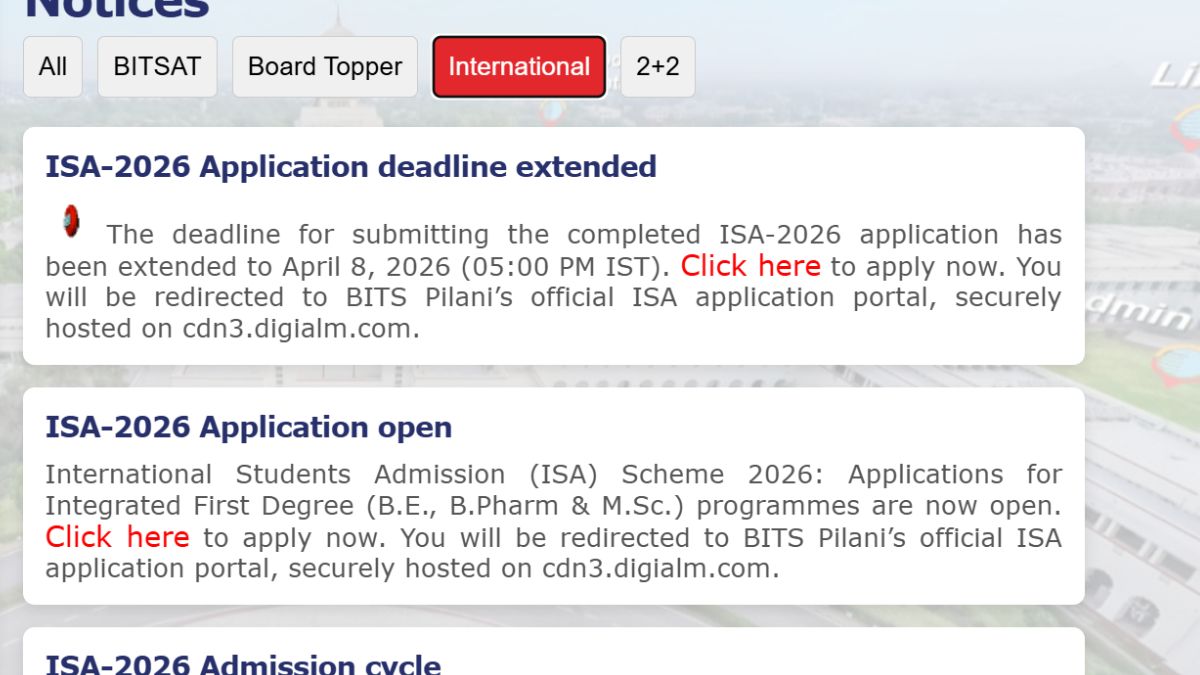 Birla Institute of Technology & Science (BITS) Pilani has extended the registration deadline for International Students Admission (ISA) 2026. Earlier, the process was scheduled to conclude on April 5, however, the same has been extended to April 8 (5 PM). Foreign citizens who seek admission into the BITS campuses at Pilani, Goa, and Hyderabad are eligible to apply for the BITS ISA scheme. Admissions under this scheme will be based on the candidate's SAT scores. Moreover, an applicant has to meet the minimum eligibility requirements laid out by the authorities.