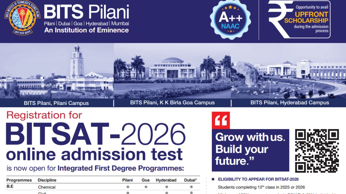 The Birla Institute of Technology and Science (BITS) Pilani has officially released the BITSAT 2026 poster and notification for the BITS Admission Test (BITSAT) 2026. The authority is conducting the BITSAT exam for admission to undergraduate programs such as B.E, B.Pharm and Integrated M.Sc across its campuses in Pilani, Goa, Hyderabad and Dubai.
