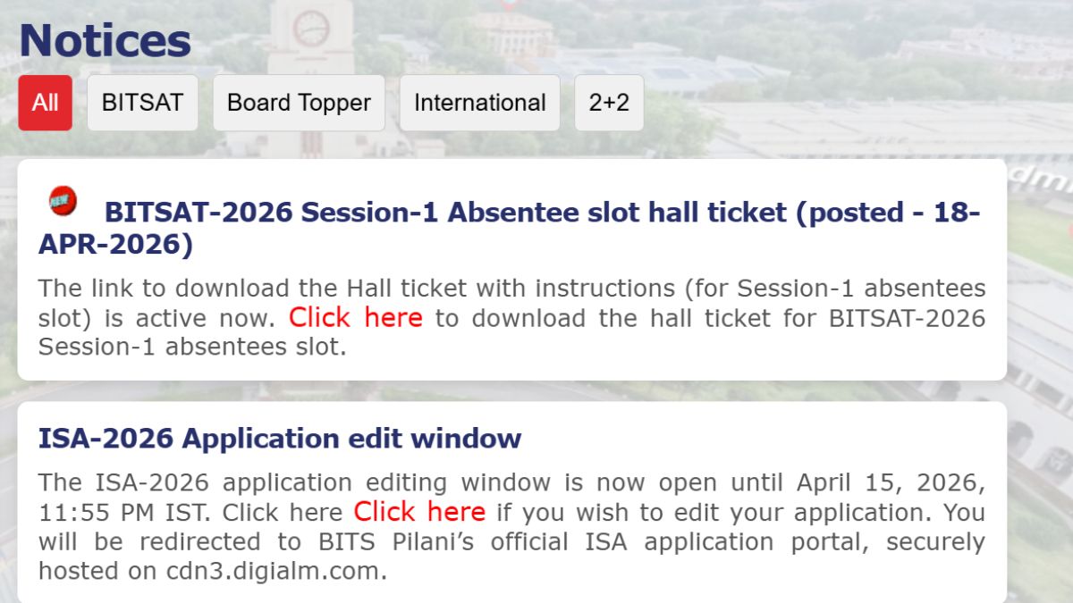 Birla Institute of Technology and Science (BITS), Pilani, has issued the BITSAT 2026 hall ticket for the absentee slot. Students who have registered for the BITSAT absentee slot can now check their allotted exam centre address, date and time. To download the BITSAT absentee slot admit card, candidates have to log in using their application number and password. The authority will conduct the BITSAT 2026 session 1 absentee slot exam on April 19.