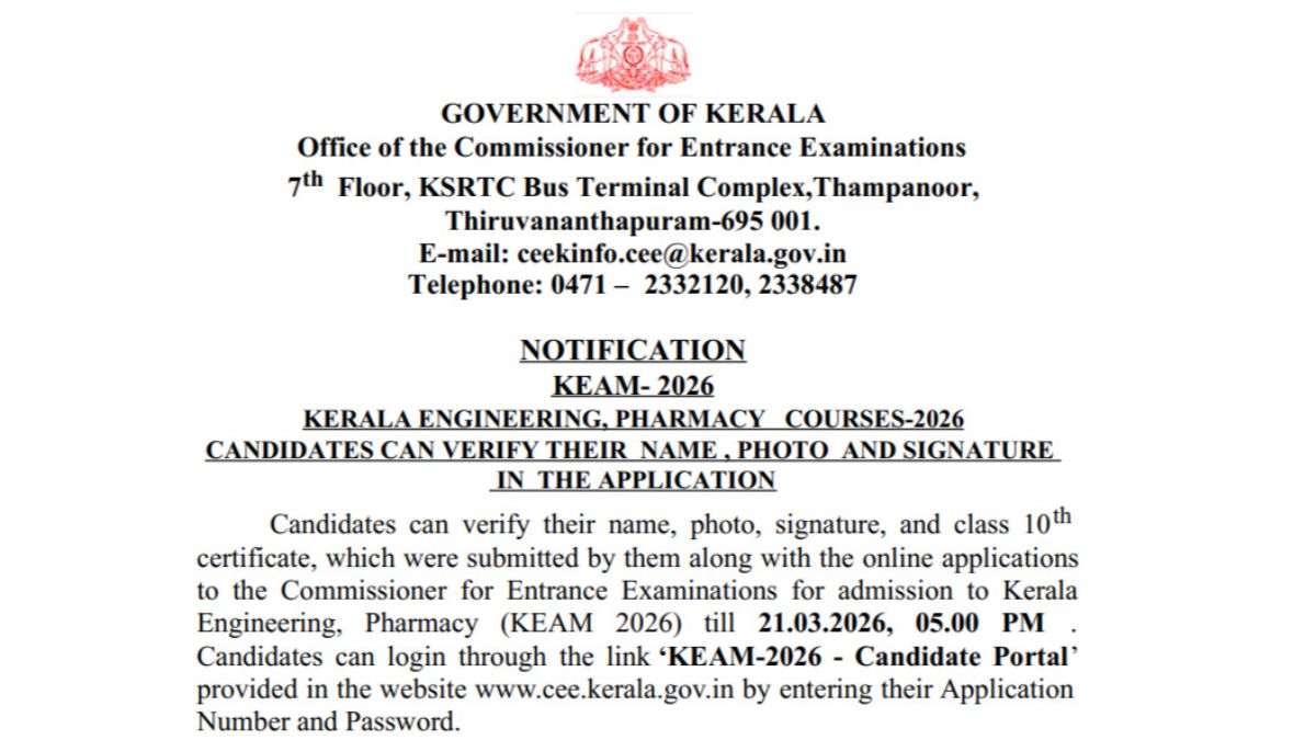 The Commissioner for Entrance Examinations (CEE) has started the online verification and correction facility for KEAM 2026 registered candidates regarding their name, photo and class 10 certificate. Candidates can verify these details by logging into their KEAM 2026 candidate portal at cee.kerala.gov.in. The last date to complete the verification and correction process is March 21 by 5 pm.
