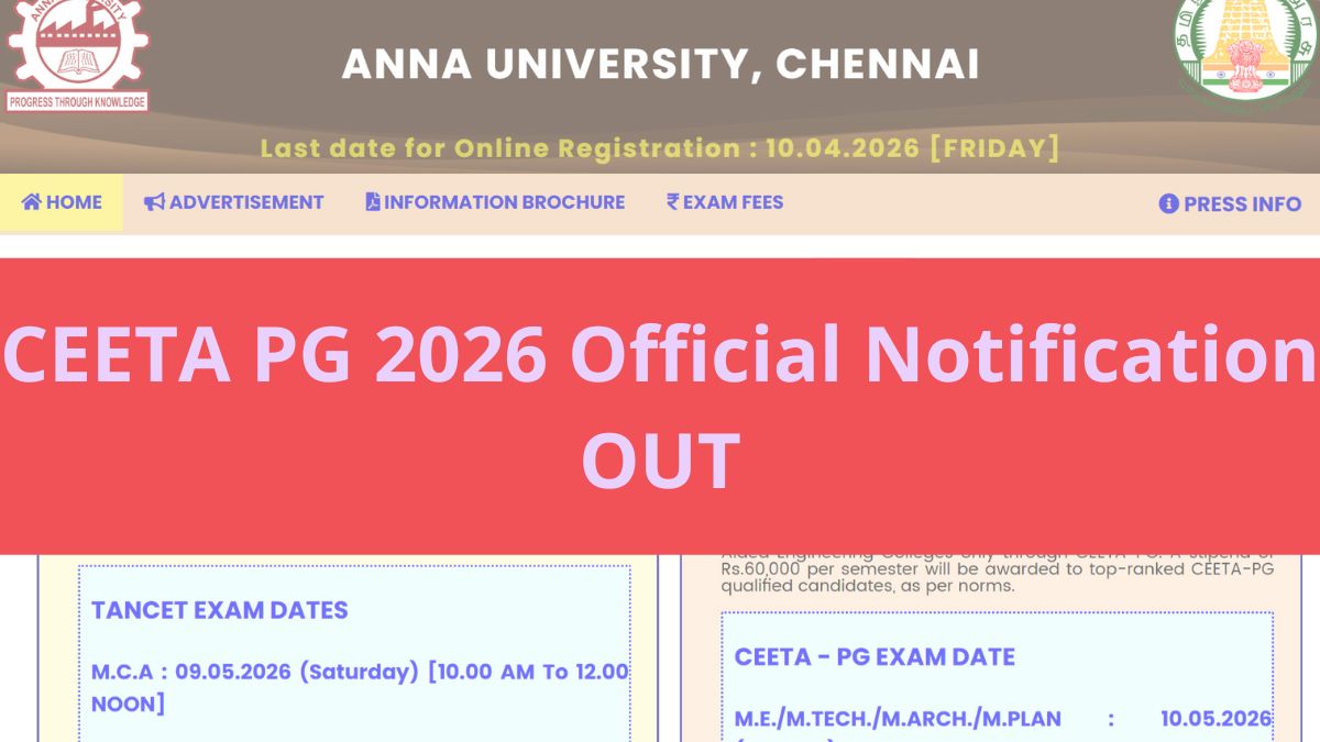 Anna University, Chennai, has released official notification for CEETA PG 2026 today (March 10). CEETA 2026 online registrations will begin from March 16, and the CEETA PG 2026 registration last date is April 10. Read below to know more about registration fees, exam timings, stipend amount and more.