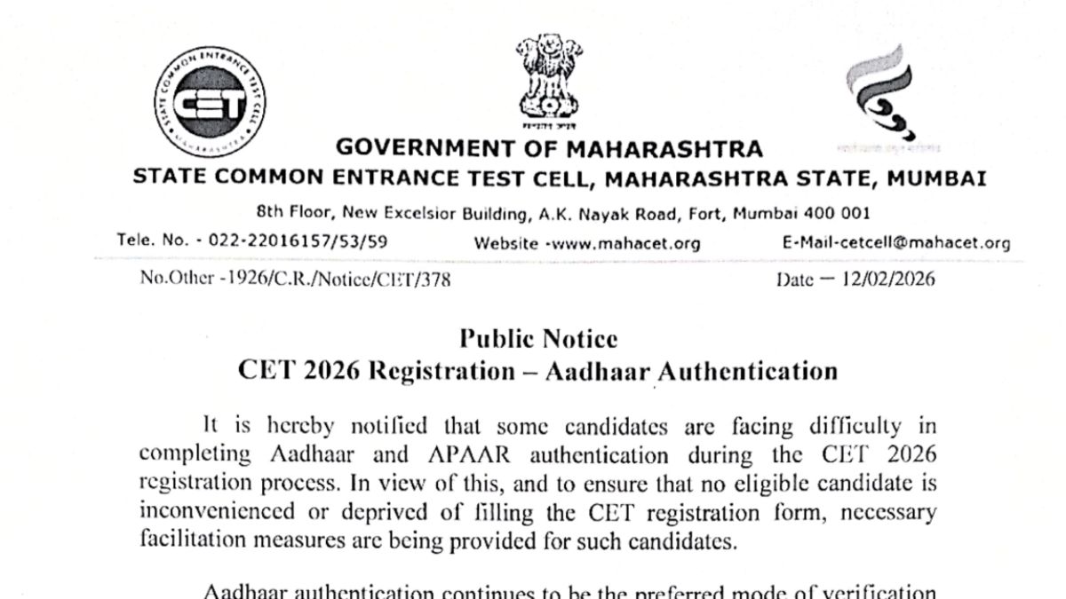 Maharashtra State Common Entrance Test (CET) cell has issued a notice on Feb 12 regarding the CET 2026 registrations. In a major relief for thousands of students, the Maharashtra State Common Entrance Test (CET) Cell has announced that candidates facing issues with Aadhaar and APAAR authentication can now complete their CET 2026 registration without Aadhaar and APAAR authentication. To ensure that no eligible candidate is unable to apply due to factors beyond their control, the CET Cell has introduced a new facility. From February 13, 2026, candidates who are unable to complete Aadhaar and APAAR authentication can fill and submit their MHT CET 2026 application form without the authentication.