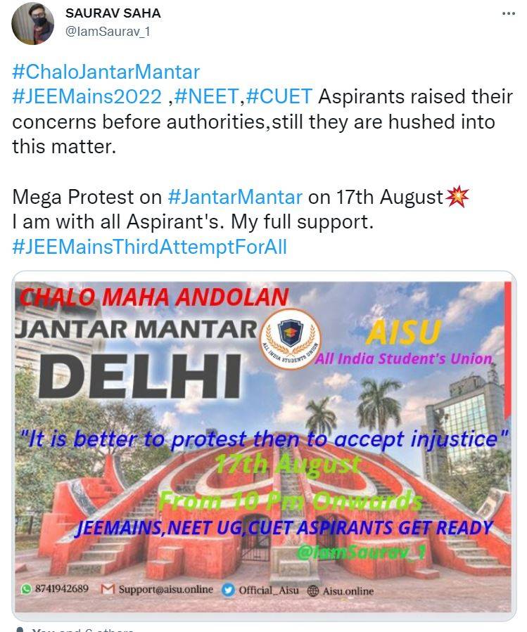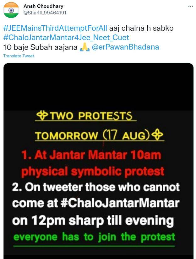 Thousands of students have been flooding Twitter with various hashtags such as #ChaloJantarMantar #JEEMainsThirdAttemptForAll in an attempt to rally protests against the NTA and make their demands heard.