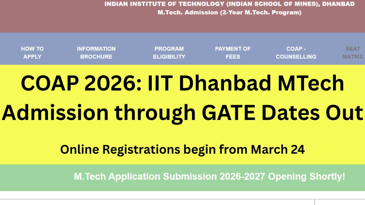 IIT Dhanbad COAP 2026 registration dates for MTech can be checked here. COAP 2026 counselling dates are now available, and with that IIT Dhanbad will begin MTech registration through GATE. IIT Dhanbad will begin online registration for COAP 2026 GATE counselling from March 24. Read below to know more about IIT Dhanbad MTech 2026 admission.