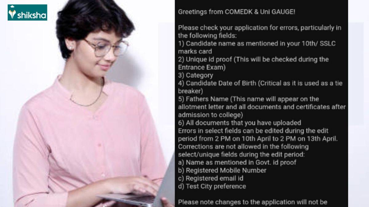 The Consortium of Medical, Engineering and Dental Colleges of Karnataka has activated the COMEDK UGET 2026 form correction window on April 10, at 2 PM. Candidates who have submitted their application forms can edit their details by logging into the candidate portal at comedk.org. Students who applied for COMEDK UGET 2026 are receiving emails from the officials about corrections in their application forms.