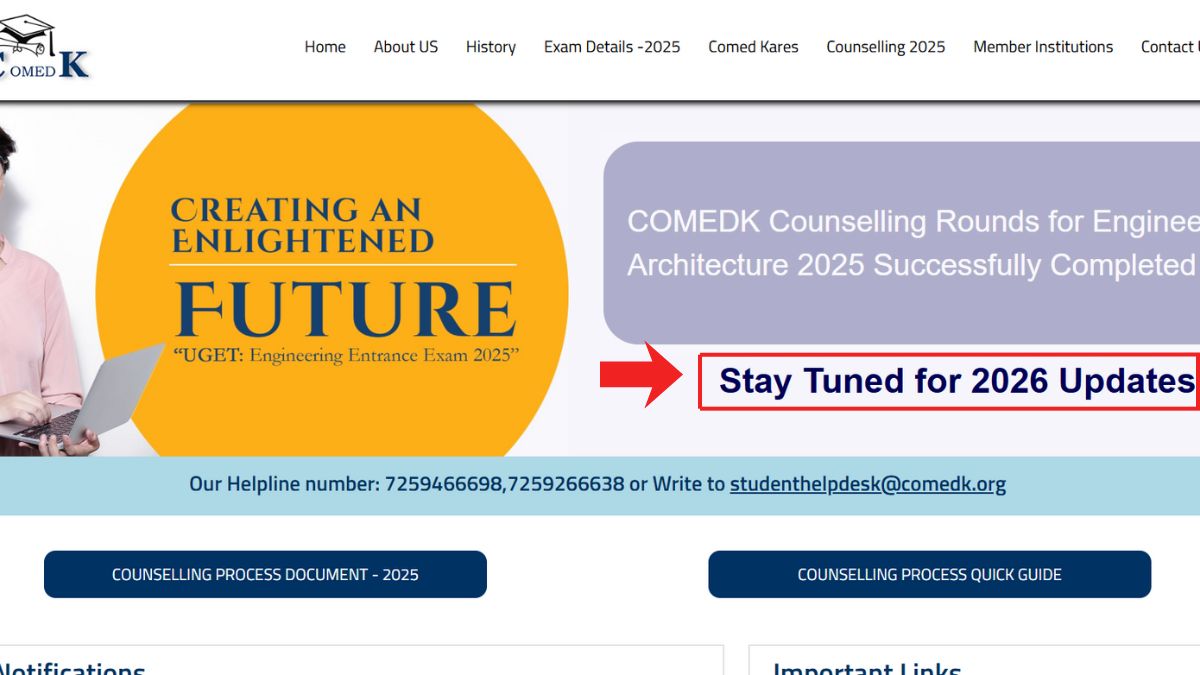 The Consortium of Medical, Engineering and Dental Colleges of Karnataka (COMEDK) has completed the counselling process for the 2025 academic session and is now gearing up for the 2026 admission cycle. The authority has updated the official website at comedk.org with the message: “Stay Tuned for 2026 Updates”. This indicates that the COMEDK UGET 2026 notification can be expected soon.