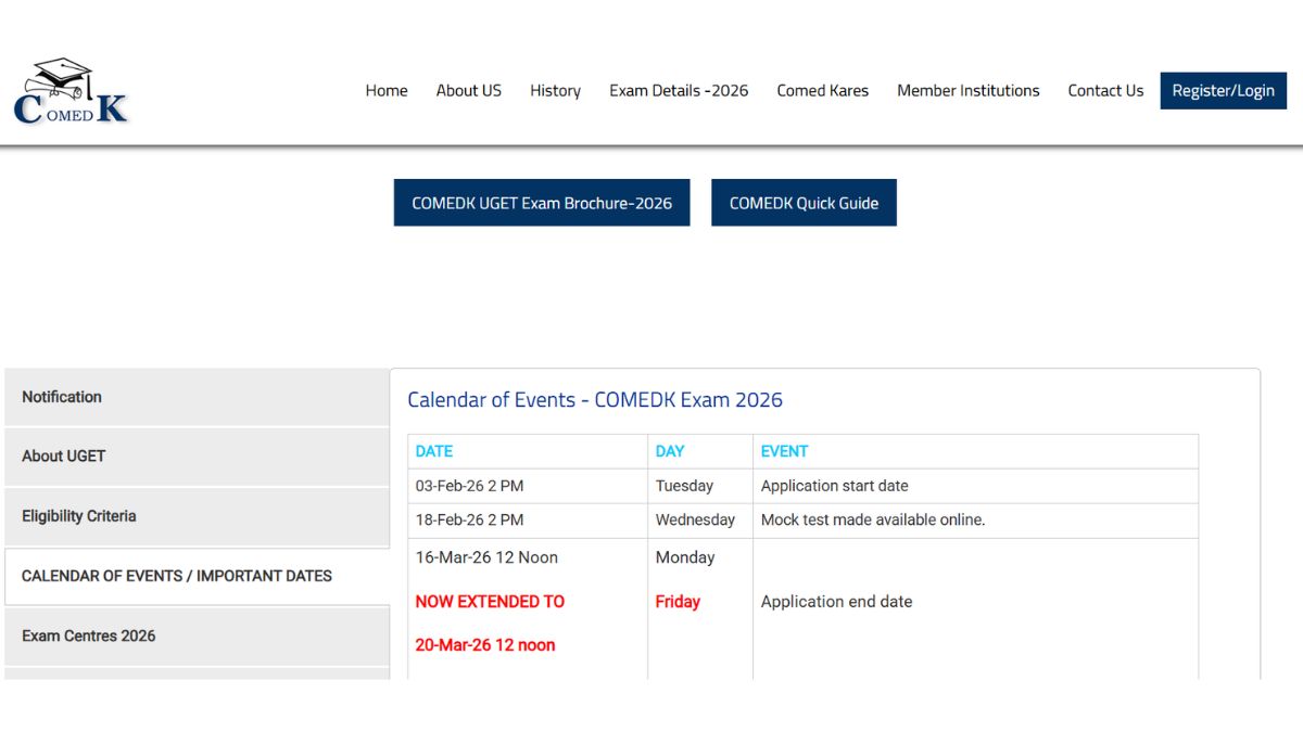 The Consortium of Medical, Engineering and Dental Colleges of Karnataka (COMEDK) has extended the COMEDK 2026 registration. The last date to apply for COMEDK 2026 is March 20, 12 PM. Earlier, the COMEDK registration deadline was announced as March 16. Candidates can access the COMEDK registration link on the website, comedk.org. Students who have obtained atleast 45% marks in their qualifying exam can fill out the application form.