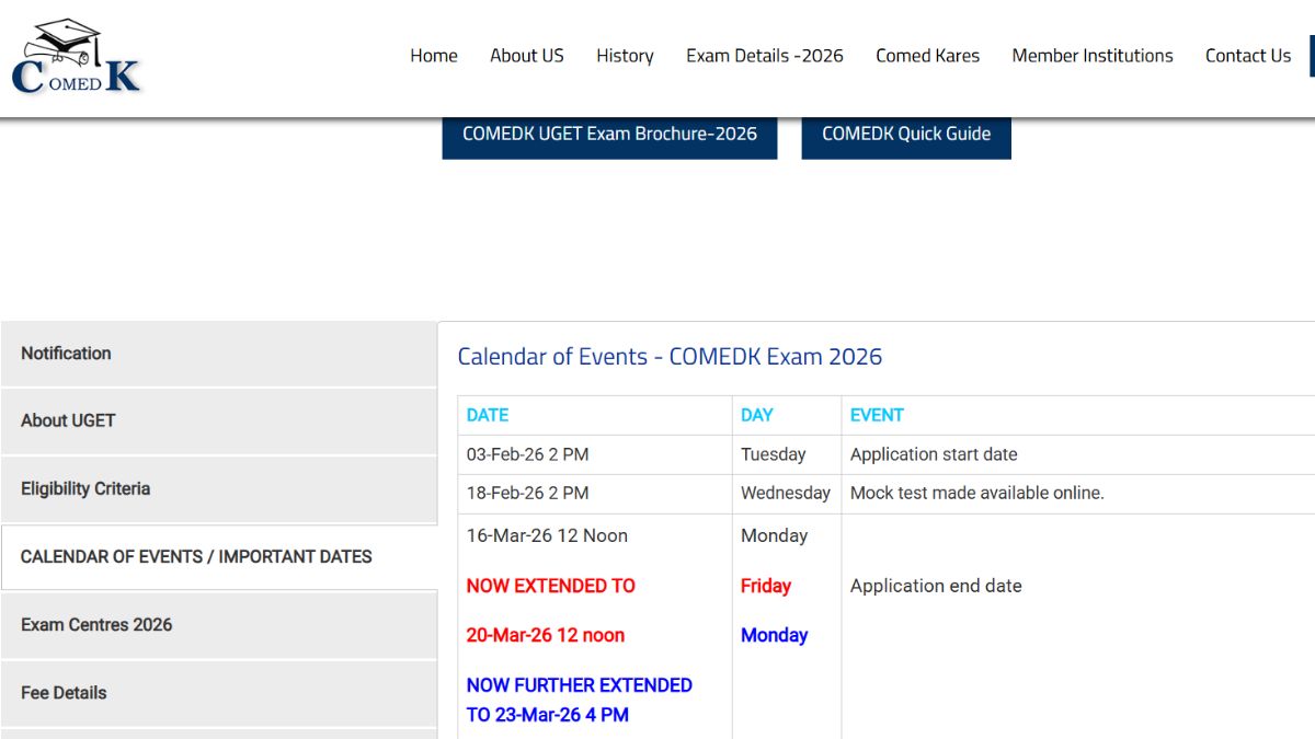 The Consortium Of Medical Engineering & Dental Colleges in Karnataka (COMEDK) has extended the registration deadline for Undergraduate Entrance Test (UGET) 2026 once again. Students who have not yet applied now have more time to complete their application process. Candidates can now register for COMEDK 2026 till March 23, 2026, up to 4 PM. The COMEDK registration link is available on the website, comedk.org.