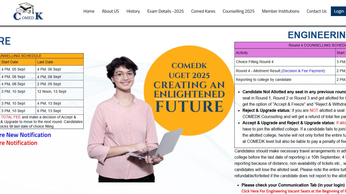 The authority will release the COMEDK 2025 round 4 seat allotment on September 5 at 2 PM. Candidates who are allotted seats in this round have to submit their decisions by September 9, 2 PM.