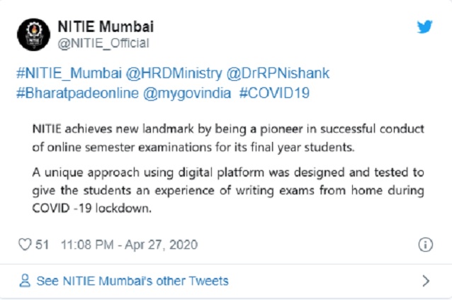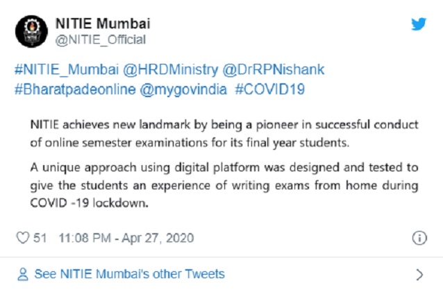 “NITIE, Mumbai has achieved a new landmark by successfully conducting online semester examinations for its final year students,” the institute tweeted.