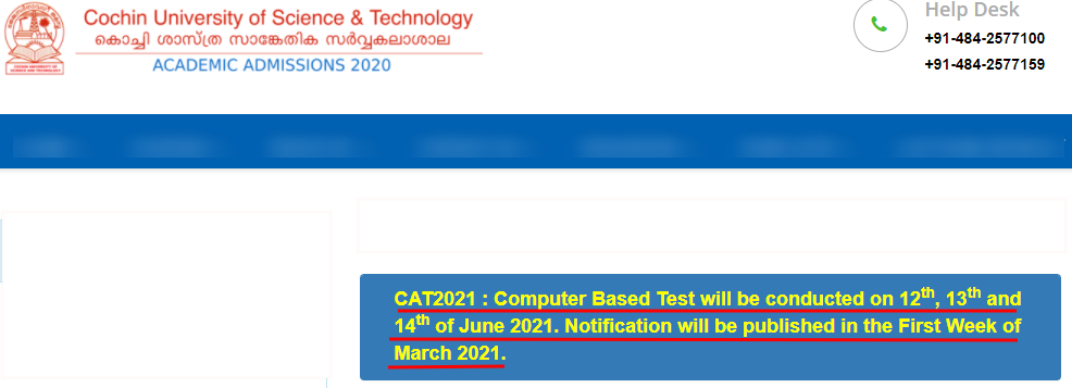 CUSAT CAT 2021 exam dates have been declared by Cochin University of Science and Technology. The exam will be held on June 12, 13 and 14 whereas the official notification will be published in the first week of March 2021.