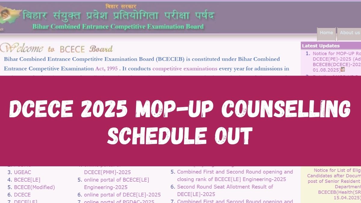 The Bihar Combined Entrance Competitive Examination Board (BCECEB) has announced the complete schedule for DCECE mop-up counselling 2025 on bcece.bihar.gov.in. The authority is conducting the DCECE 2025 mop-up counselling in online mode to fill the vacant seats after rounds 1 & 2 counselling. The mop-up counselling of DCECE 2025 will start with the choice-filling process on August 4, 2025. Candidates can submit their willingness/choice-filling by August 8. To submit the choice-filling for the DCECE mop-up round, candidates have to log in to the candidate portal with their registration number and password.