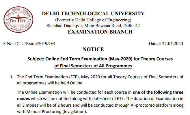 The Delhi Technological University (DTU) will be conducting all its end term examinations (ETE) online. According to the reports, the ETE for theory subjects will be conducted online by DTU. The exams would be held sometime this month but the schedule is not yet out. The University will be conducting the exams through an “AI-proctored platform along with Manual Proctoring (Invigilation)”. The exams would be in one of three modes – multiple-choice questions, a combination of multiple-choice questions and subjective answers, and case study/project-based exams.