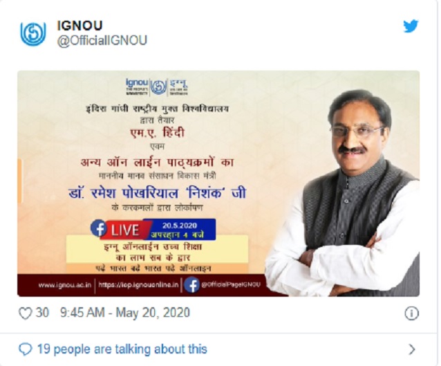 Union Minister of Human Resource and Development Ramesh Pokhriyal Nishank will today launch an online curriculum for the MA Hindi and other courses to be offered at Indira Gandhi National Open University (IGNOU).