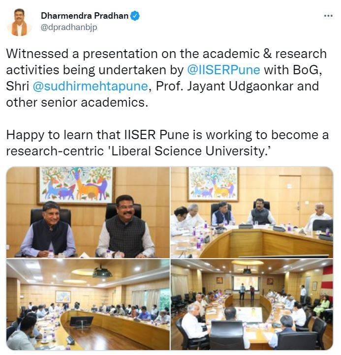 Taking it to Twitter, the Education Minister said, "Witnessed a presentation on the academic & research activities being undertaken by IISER Pune with BoG, Shri @sudhirmehtapune, Prof Jayant Udgaonkar and other senior academics. Happy to learn that IISER Pune is working to become a research-centric 'Liberal Science University.’"