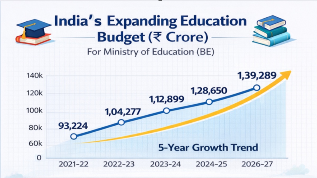 India’s education budget has undergone a structural expansion over past five years, rising from INR 93,224 crore in 2021-22 to INR 1.39 lakh crore in 2026-27, according to Union Budget allocations. Increase is not just incremental but directional with funding increasingly tied to employability, industry-linked education, emerging technologies and regional capacity building rather than only enrolment expansion.