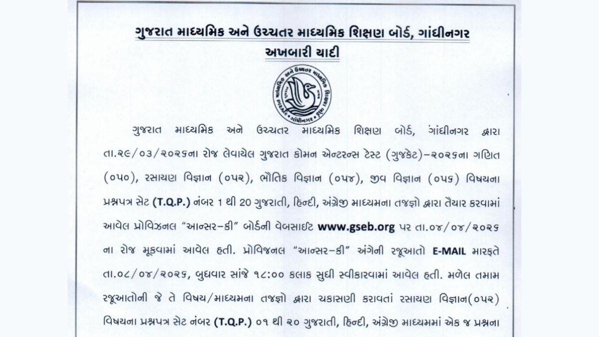 After the objection window closed, subject experts reviewed all the representations submitted by candidates. Based on this review, the board has made a correction in the answer to one question in the Chemistry subject (T.Q.P. No. 01). The revised and final answer key for Chemistry has now been published, incorporating the changes across Gujarati, Hindi and English mediums.