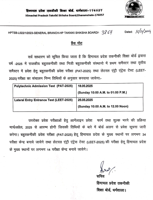 HP PAT Exam Date 2025: H.P Takniki Shiksha Board has released the Himachal Pradesh Polytechnic exam date 2025 on the official website. Applicants can check HP PAT 2025 exam date at hptechboard.com. As per the schedule, HP PAT 2025 exam is scheduled to be conducted on May 18. The authorities will conduct the HP PAT exam 2025 in offline pen and paper mode. The exam will be conducted for a duration of 3 hours in multiple choice format. Applicants are advised to keep track of HP PAT official website to avoid missing any event related to the exam.