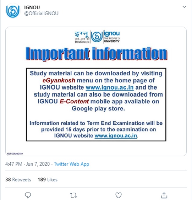 IGNOU June TEE 2020: Information to be released 15 days prior to exam date