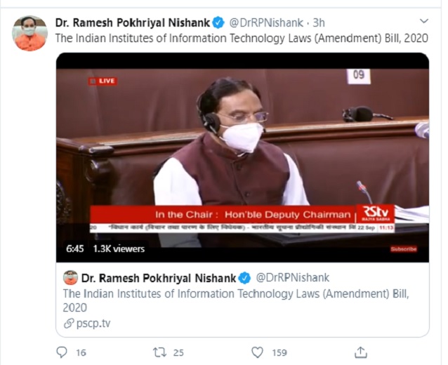 The Indian Institutes of Information Technology Laws (Amendment) Bill, 2020 was passed by Lok Sabha in the previous session on March 20, 2020. The bill was introduced in the Rajya Sabha or Upper House on September 21, 2020, by the Minister of Education, Dr Ramesh Pokhriyal Nishank.