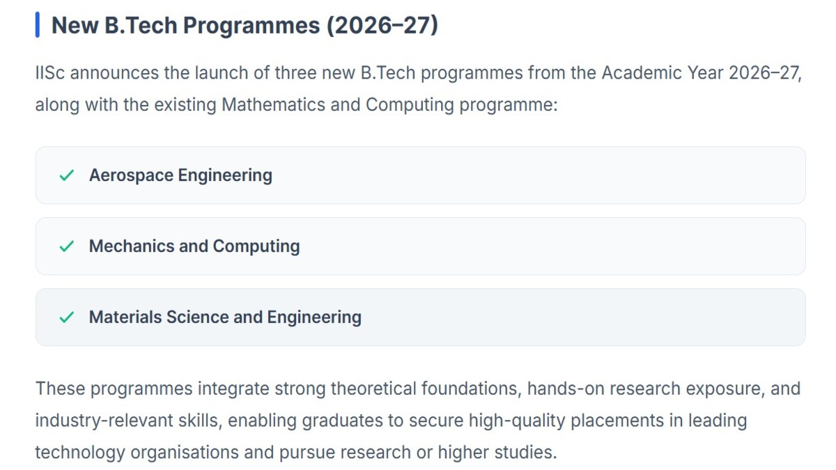 IISc Bengaluru has announced the launch of new BTech courses in Aerospace Engineering, Mechanics & Computing, and Materials Science Engineering this year. Admission to all three newly launched programs, including the one already running course in Mathematics and Computing, will be through JEE Advanced exam.