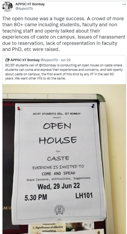 According to APPSC, this is a first-of-its-kind event conducted by any IIT in the last 60 years. The students collective also called for similar events at other IITs. A tweet posted by the official account of the student cell reads, "SC/ST students cell of @iitbombay is conducting an open house on caste where students can come and express their experiences and concerns, and talk openly about caste on campus, the first event of this kind by any IIT in the last 60 years. We want other IITs to do the same.”