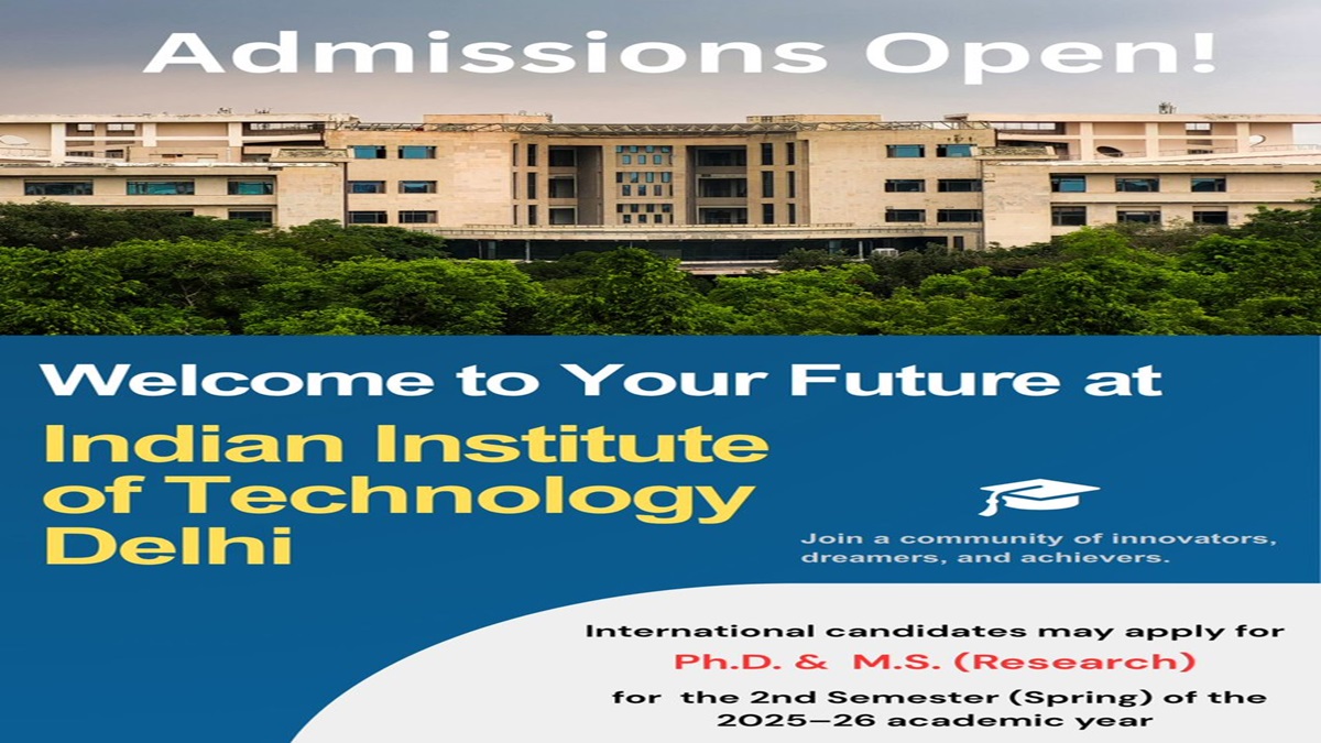 An official tweet by IIT Delhi reads: "The Indian Institute of Technology Delhi (#IITDelhi) is delighted to announce that the admission portal for #international applicants to our #PhD. and M.S. (#Research) programmes for the 2nd #semester (spring) of the 2025β26 academic year is now open!"