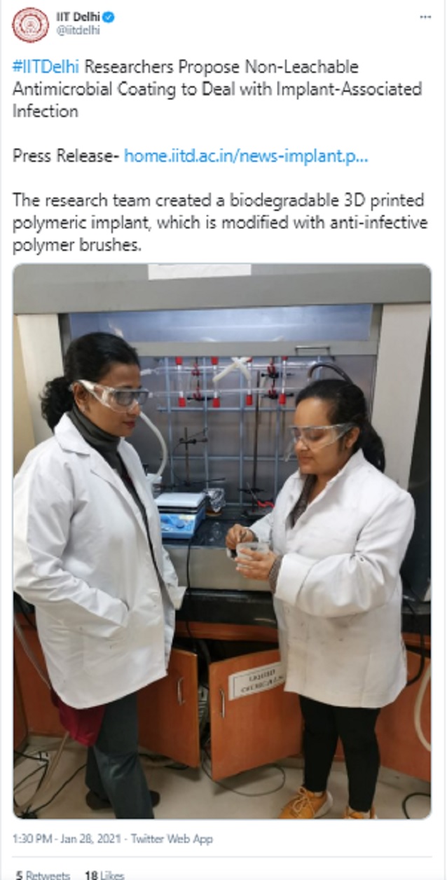 The research team also include Ms Shaifali, Department of Materials Science and Engineering, IIT Delhi; Prof Neetu Singh and Mr Akshay Joshi (Centre for Biomedical Engineering, IIT Delhi). Implants are installed inside the body surgically and their prolonged usage often leads to infections that arise from the microbial biofilms that are formed on the implant's surface causing fatalities worldwide and added hospitalization costs.