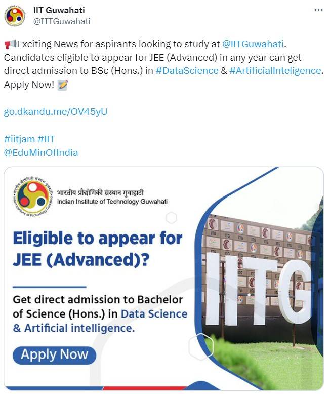 Indian Institute of Technology (IIT) Guwahati has invited applications from admission to BSc (Hons.) in Data Science and Artificial Intelligence. Candidates eligible to appear for JEE (Advanced) in any year can get direct admission, according to the official announcement made by the Institute via its official Twitter account. Applications for October 2023 batch are now open. The last date to submit the application is on or before September 10, 2023.