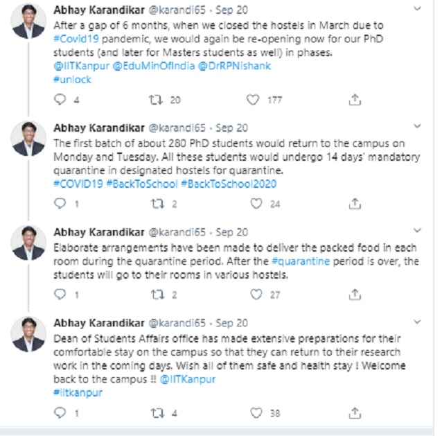 The Indian Institute of Technology (IIT) Kanpur has announced that it has decided to reopen its hostels in a phased manner starting with PhD students. In a tweet, Abhay Karandikar, Director, IIT Kanpur said “After a gap of 6 months, when we closed the hostels in March due to #Covid19 pandemic, we would again be re-opening now for our PhD. students (and later for Masters students as well) in phases”.