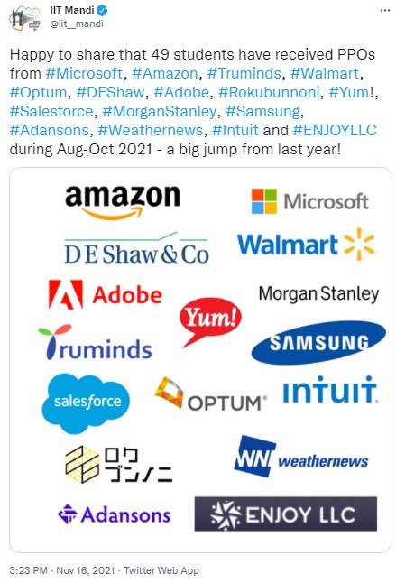 Meanwhile, 49 students of the institute received pre-placement offers (PPOs) from major recruiters such as Microsoft, Amazon, Walmart, etc, during August-October 2021. The institute took to Twitter to announce the same. It tweeted, “Happy to share that 49 students have received PPOs from #Microsoft, #Amazon, #Truminds, #Walmart, #Optum, #DEShaw, #Adobe, #Rokubunnoni, #Yum!, #Salesforce, #MorganStanley, #Samsung, #Adansons, #Weathernews, #Intuit and #ENJOYLLC during Aug-Oct 2021 - a big jump from last year!”